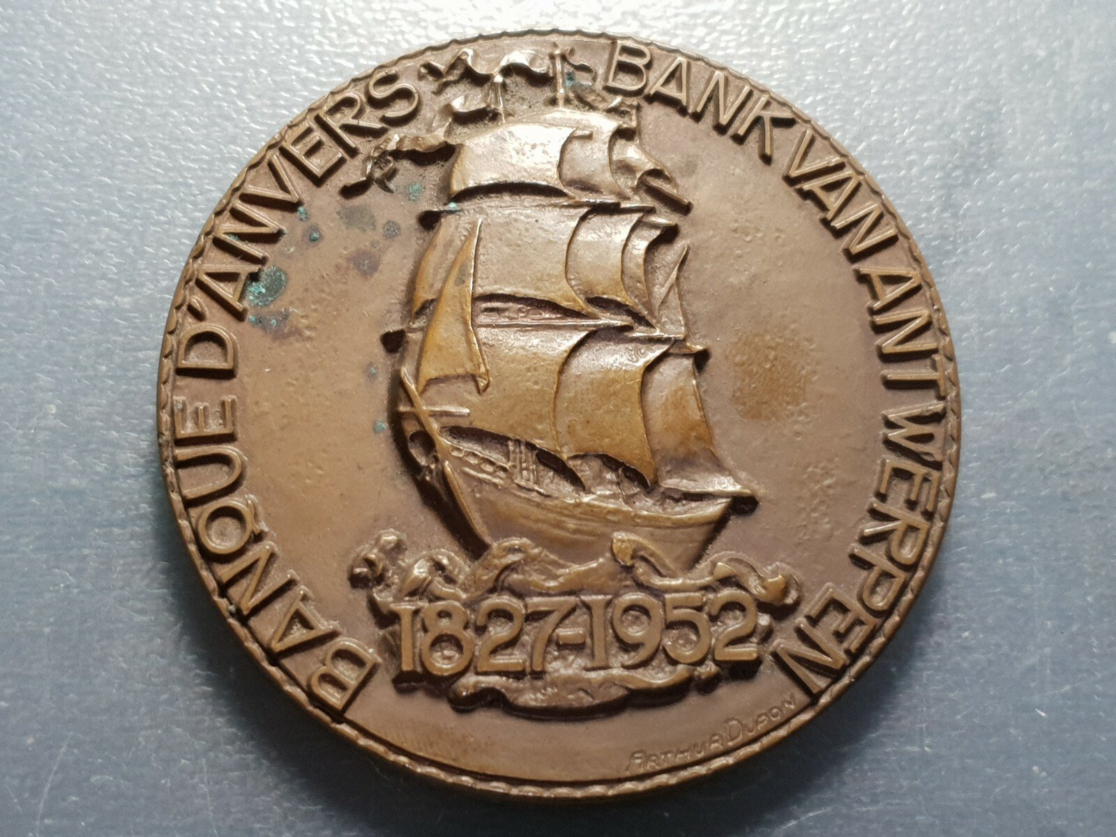 BELGICA MEDALLA MUY GRANDE CON BARCO 1952 BANCO DE AMBERES ANVERS ANTWERPEN 80mm