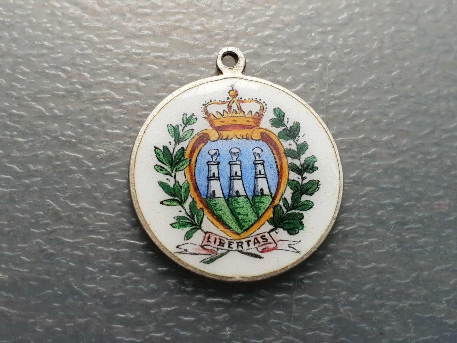 SAN MARINO MEDALLA CON ESCUDO DEL PAIS PLATA Y ESMALTES 25×22 mm